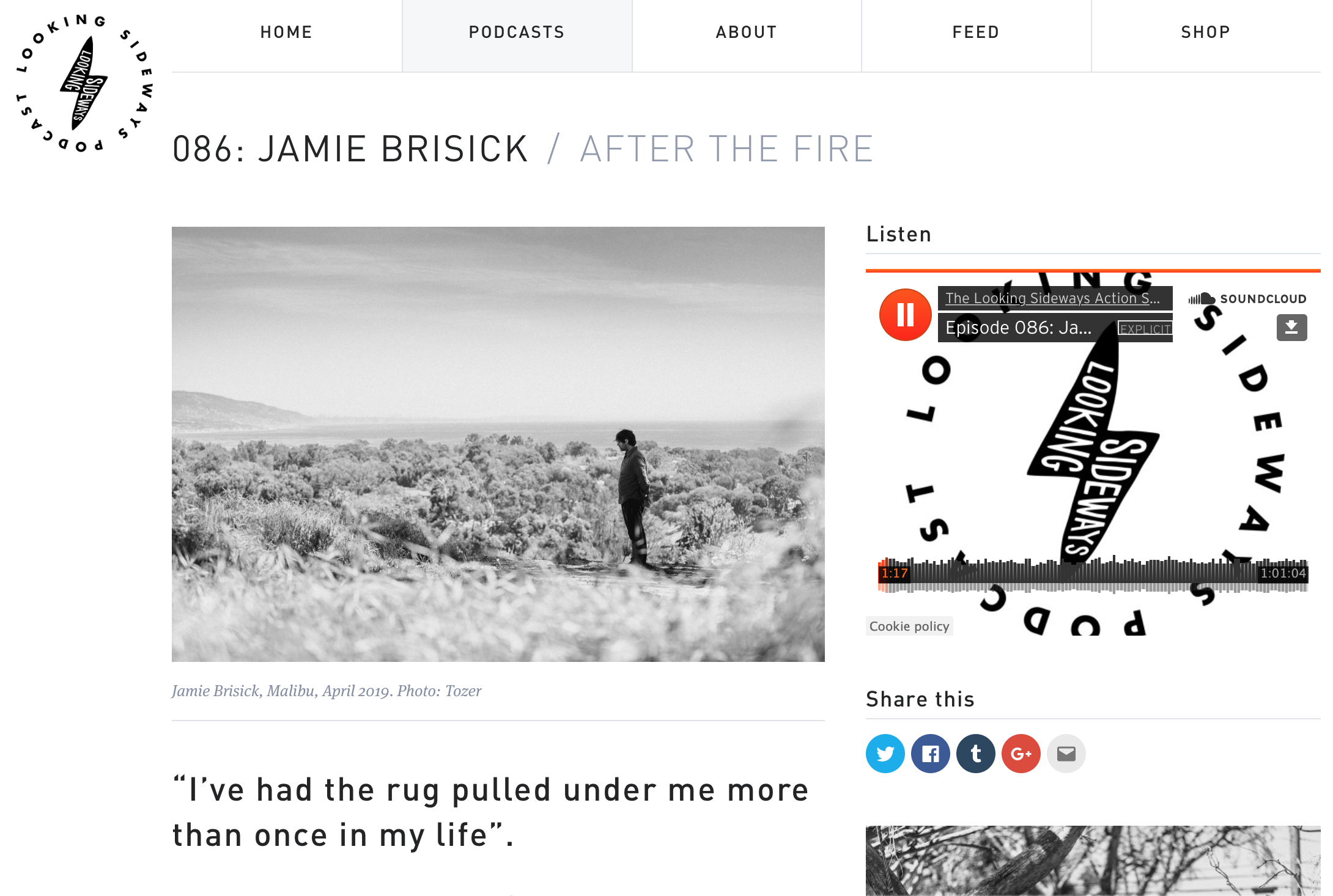 I met up with Jamie in Malibu at the start of my recent trip. We recorded this episode of the podcast at the site of his former home, exploring in depth the emotions that such experiences bring forth – loss, grief, self-examination and, ultimately, hope.