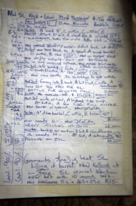 In ’88 Rip Curl hired him to coach the team, of which I was a member. I was as excited about a glimpse into his inner workings as I was improving my lackluster results. He kept obsessive, blow-by-blow contest diaries, which he wrote in tiny print. He recorded rides with the visceral animation of an avid finger boarder. A Tom Curren ride would look as follows: TC: 4 ft. left, vert, vert, big vert, float, cutback, snap, closeout float. A rail bog or mistimed turned was simply an “error.” He didn’t score waves with numbers but rather P (poor), A (average), G (good), and VG (very good), with added plus- and minus-signs like they do on school report cards. Occys, Currens, and Potters occasionally scored XLs.