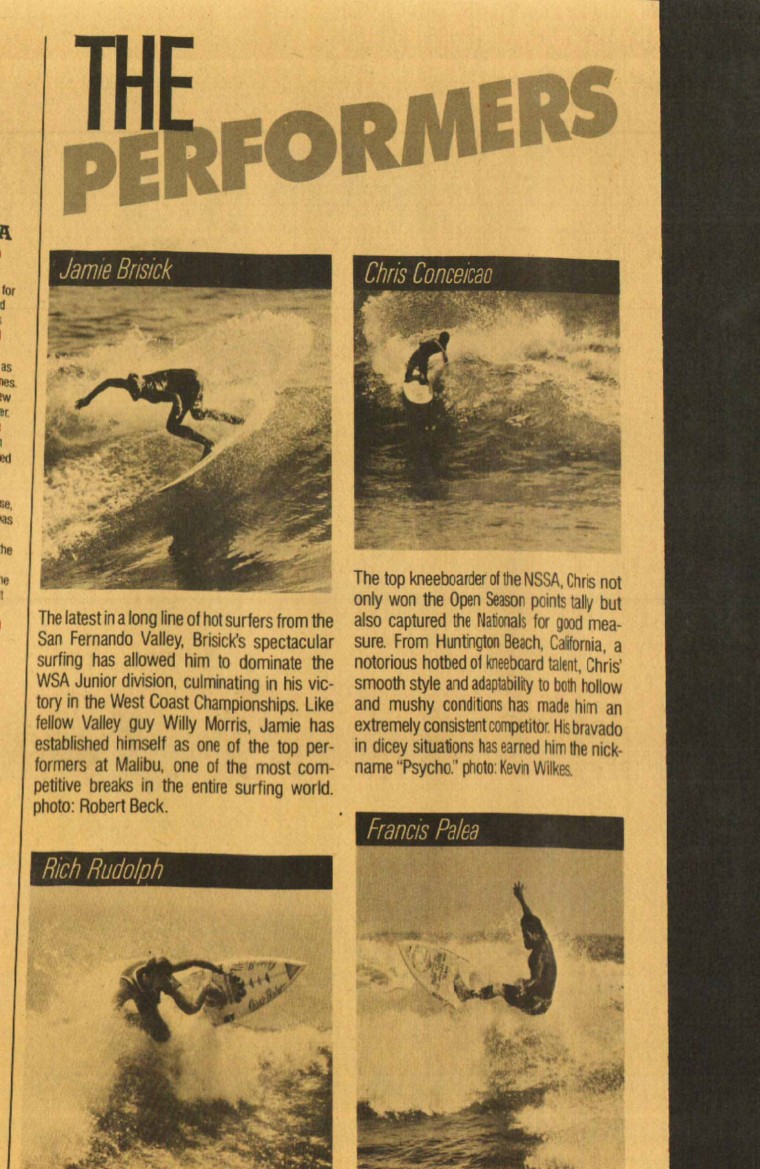 He coached Curren, Damien Hardman, Marty Thomas, Wes Laine, Stuart Bedford Brown, John Shimooka, and several others, which was quite genius when I think of it now. By taking blow-by-blow notes of nearly every heat from the early rounds onward, he was perhaps more in tune with the judges than even they themselves were. By the time he got to the crucial Curren or Hardman heats, he knew exactly how they were scoring tubes, length of ride, the lateral vs. the vertical, rights vs. lefts, etc. This is not to mention the fact that he was getting paid on a sliding-scale incentive. Curren needed to get, say, an 5th or above for Derek to be paid, whereas someone like myself needed a 17th or better. If my numbers were correct, he was making a small killing.