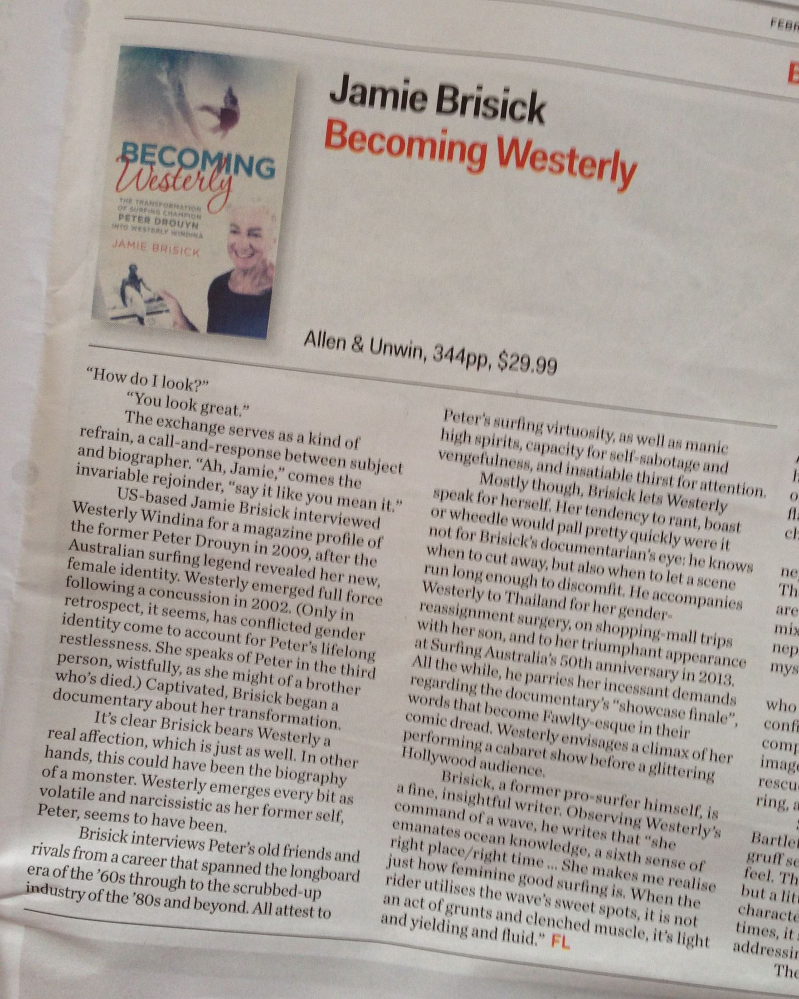 Becoming Westerly opens in a plane on the tarmac at Sydney, Westerly en route to Thailand for gender reassignment surgery. Writer and subject/friend sitting next to each other in uncomfortable economy airbus seats. Brisick is right there in the story whether he planned to be or not. Doting after her and her high-maintaining ways, he has to be a part of this story to tell it properly. Like On The Road’s Sal Paradise and Dean Moriarity, a character that shines so bright can only be explained through eyes burned by the glare. But Brisick brilliantly steers the story in and out of present day, weaving us through the fantastical surfing life of Peter Drouyn. Through the way Drouyn was failed by surfing but also how Drouyn, by his own grandiose ambitions and penchant for the sublime, forced surfing to fail him. Through his ambitions beyond a surfing career, introducing the sport to China and creating ideas for wavepools, the acting career in the UK. Through all of these incredible times that play a part in the ultimate re-emergence of Peter as Westerly in the surfing spotlight today.