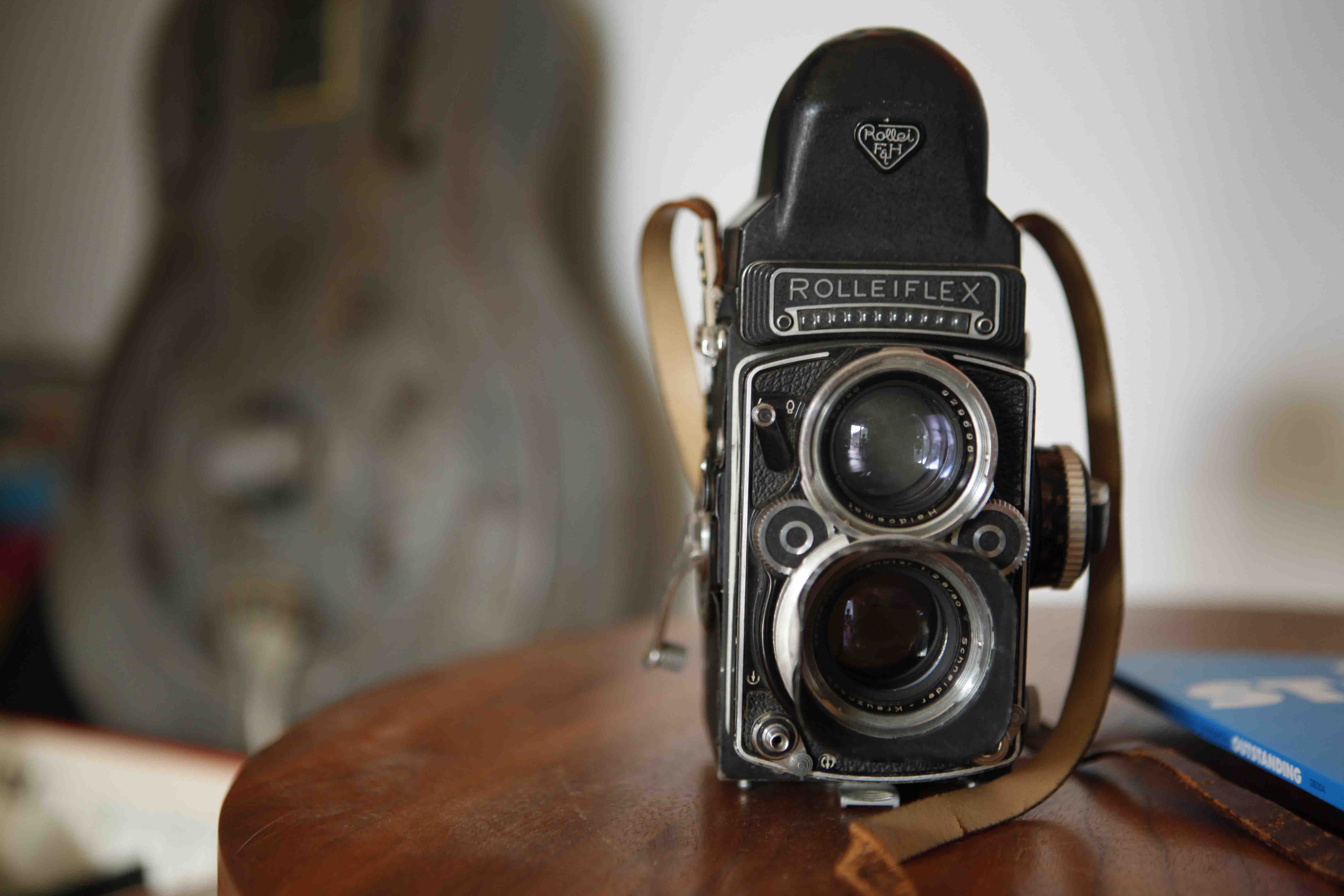 He took me upstairs to show me his office. An old case full of vintage RCA radio tubes danced with a motocross jersey signed by Motorsports Hall of Famer Dick Mann. A row of Eames molded plastic chairs squared off with a lineup of Fender guitars. Framed pictures covered the robin’s egg blue walls: black-and-white photos of old bluesmen, a signed Ronnie Wood drawing of John Belushi, a concert poster for Roy Buchanan.