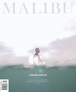 On a bright Sunday morning at a little reef break in front of the Malibu Colony, Edward Norton straddled his yellow longboard and studied the ocean. A swell loomed. He paddled out to meet it, wheeled around, stroked, and hopped to his feet. He stood tall with slightly bent knees and winged arms. Across the water he glided, a contrail of foam spurting from his tail. I watched from behind. The tide was so high, the waves breaking so close to the beachfront homes that it looked as if he were about to crash through a plate glass window and land in someone’s living room.